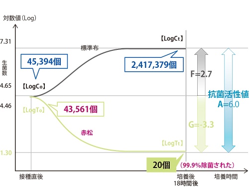 赤松材の場合、菌が付着しても抑制され、食品を腐敗から守ることが抗菌試験結果により証明されました。